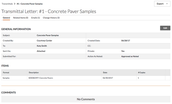 A continuación se muestra un ejemplo de un transmittal que se puede crear en Procore.