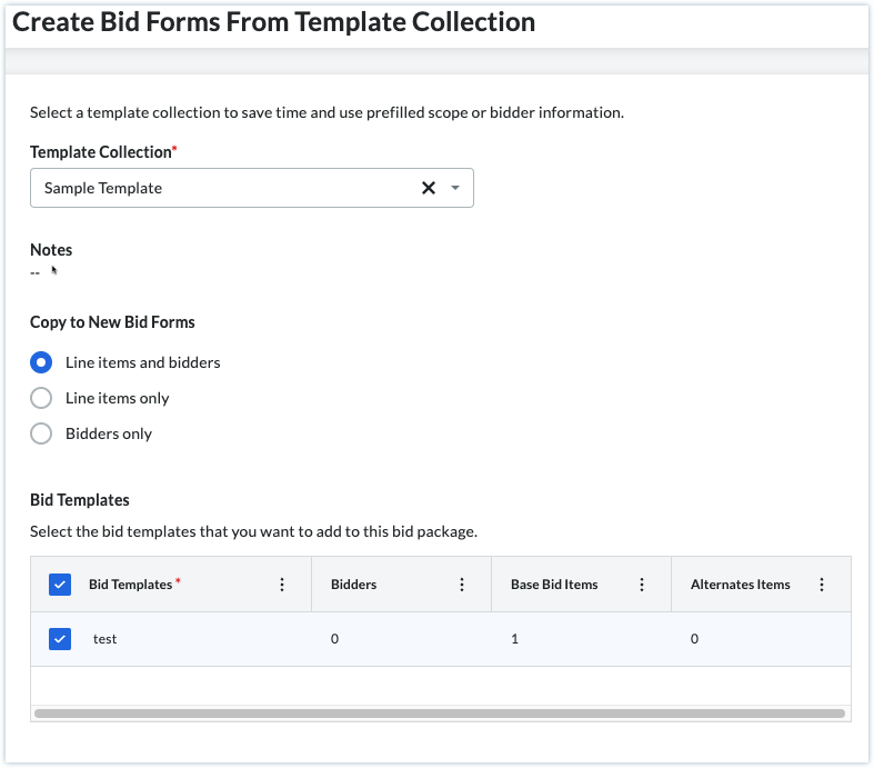 Una nueva opción llamada "De plantilla" está disponible al crear un nuevo formulario de oferta en un paquete de licitación. A continuación, elegirá de la lista de su empresa las plantillas creadas en el nivel de empresa de Procore.
